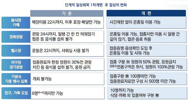 내달 1일부터 적용될 사회적 거리 두기 개편은 총 3차례에 걸쳐 완화됩니다. 1차 개편에서는 생업시설 운영제한 완화를 원칙으로, 유흥시설을 제외한 모든 시설의 이용시간을 해제합니다. 학원, 영화관, 공연장, 독서실, PC방, 식당, 카페 등을 시간제한 없이 온종일 이용 가능해집니다. 접종자와 PCR 음성확인자만 이용한다면, 영화관에서는 일행끼리 앉을 수도 있고, 팝콘과 음료도 즐길 수 있습니다.