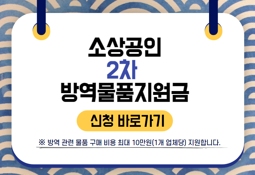 소상공인 2차 병역물품지원금이 오는 2월 14일 월요일부터 신청을 받습니다. 지원금액은 방역 관련 물품 구매 비용 최대 10만원(1개 업체당) 지원합니다. 2021. 12. 3. 이후 구입한 신용카드 전표, 현금영수증, 세금계산서 (계좌이체 확인필요)에 명시된 금액을 받을 수 있습니다.