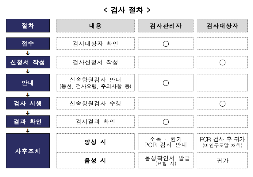 - 검체 채취 후 귀가, PCR 검사결과 확인 전까지 자택 대기 안내