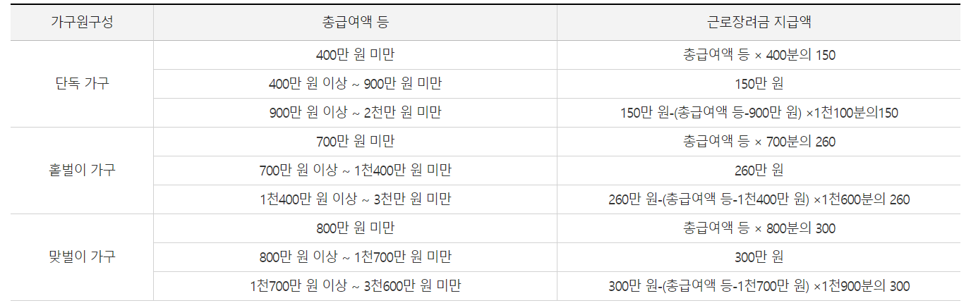 근로장려금은 열심히 일은 하지만 소득이 적어 생활이 어려운 근로자, 사업자(전문직 제외) 또는 종교인 가구에 대해 가구원 구성과 총급여액 등에 따라 산정된 근로장려금을 지급함으로써 근로를 장려하고 실질소득을 지원하는 근로연계형 소득지원 제도입니다.