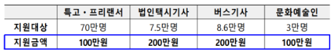 정부안(100만원)에서 두 배로 오른 200만원씩 지급됩니다. 문화예술인 지원금은 약 3만명에게 지급됩니다. 법인택시와 전세버스 기사 지원금도 당초 정부안보다 100만원 늘어난 300만원이 지급됩니다.