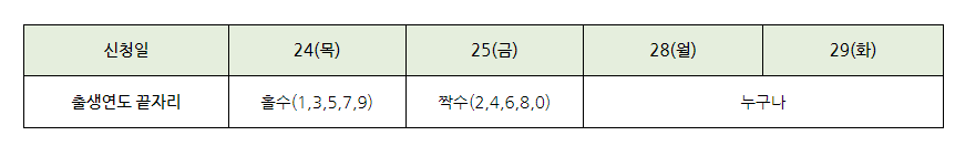 현장 신청 첫 이틀(3.24.~25.)은 출생연도 끝자리에 따라 홀짝제로 운영됩니다.