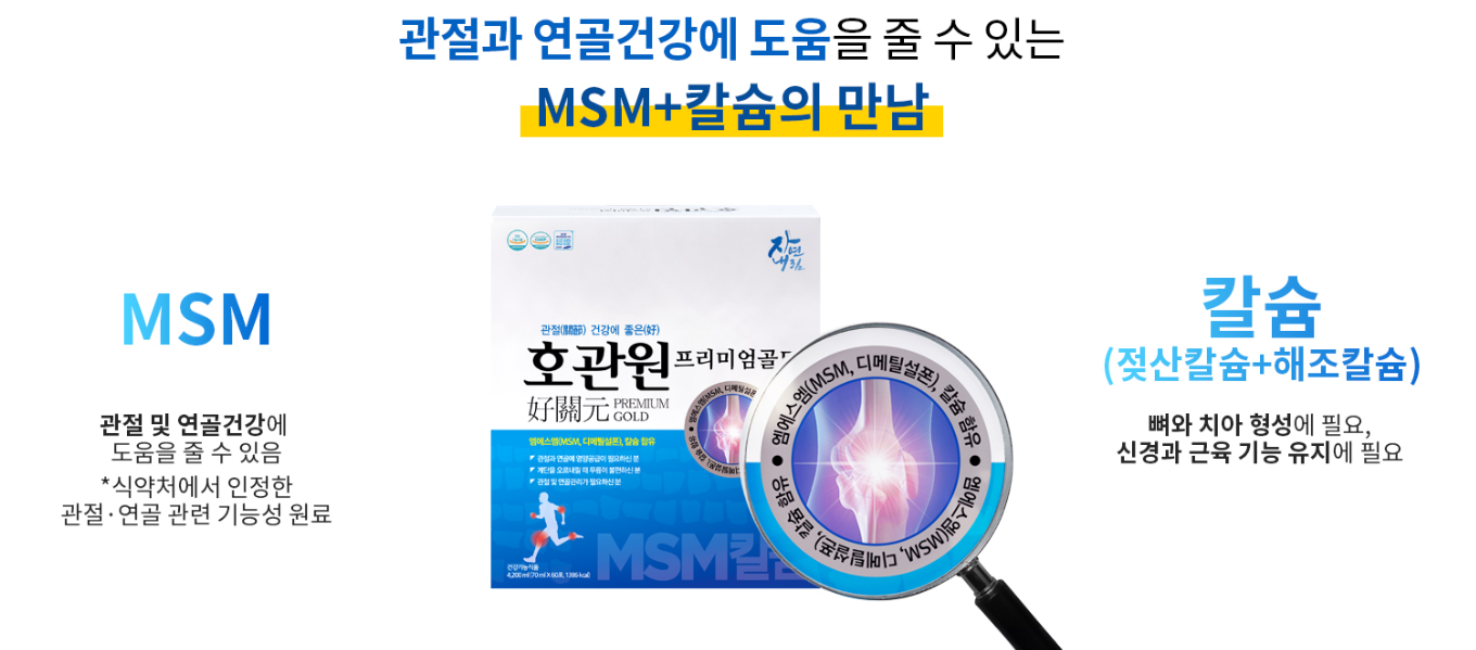 호관원 프리미엄은 동진제약에서 만든 건강보조식품으로 MSM 해조칼슘이 대표적인 성분이며, 다양한 부원료가 첨가되어있습니다.