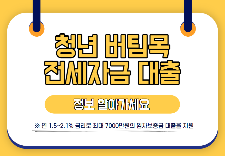 청년 버팀목 전세자금은 대출은 전세자금이 부족한 청년들에게 연 1.5~2.1%로 최대 7000만원의 임차보증금 대출을 지원해주는 사업입니다. 아래 목차를 보시고 필요한 정보를 얻어가시길 바랍니다.