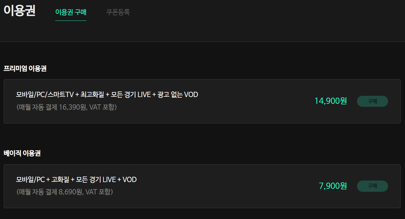 스포티비의 요금제는 현재 프리미엄 이용권 14,900원, 베이직 이용권 7,900원으로 구성되어 있습니다. 베이직 이용권을 이용해도 모바일, PC 등에서 고화질로 실시간 티비 중계를 감상할 수 있습니다.